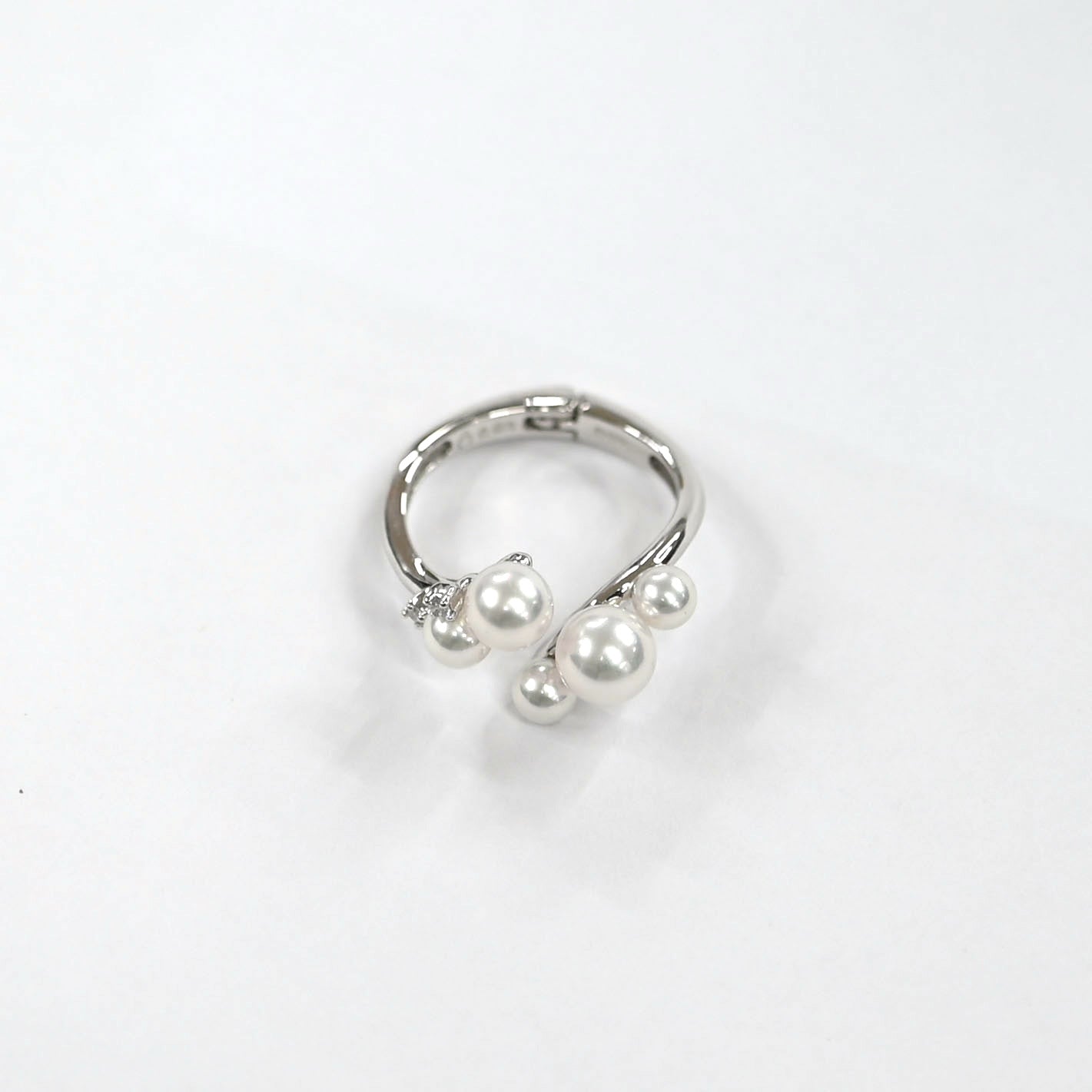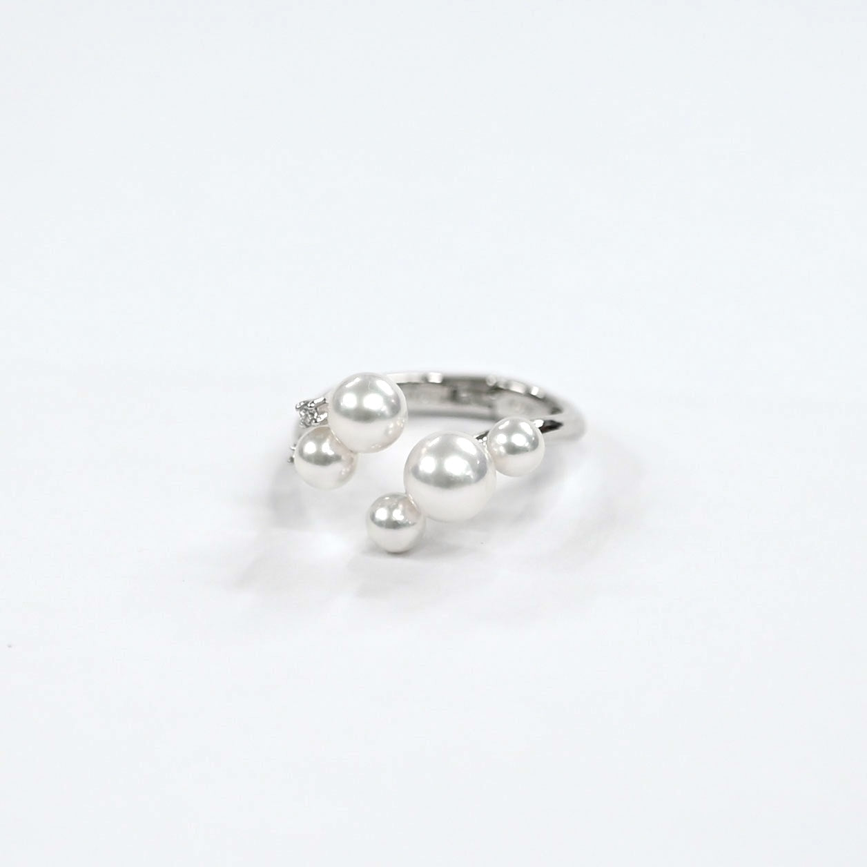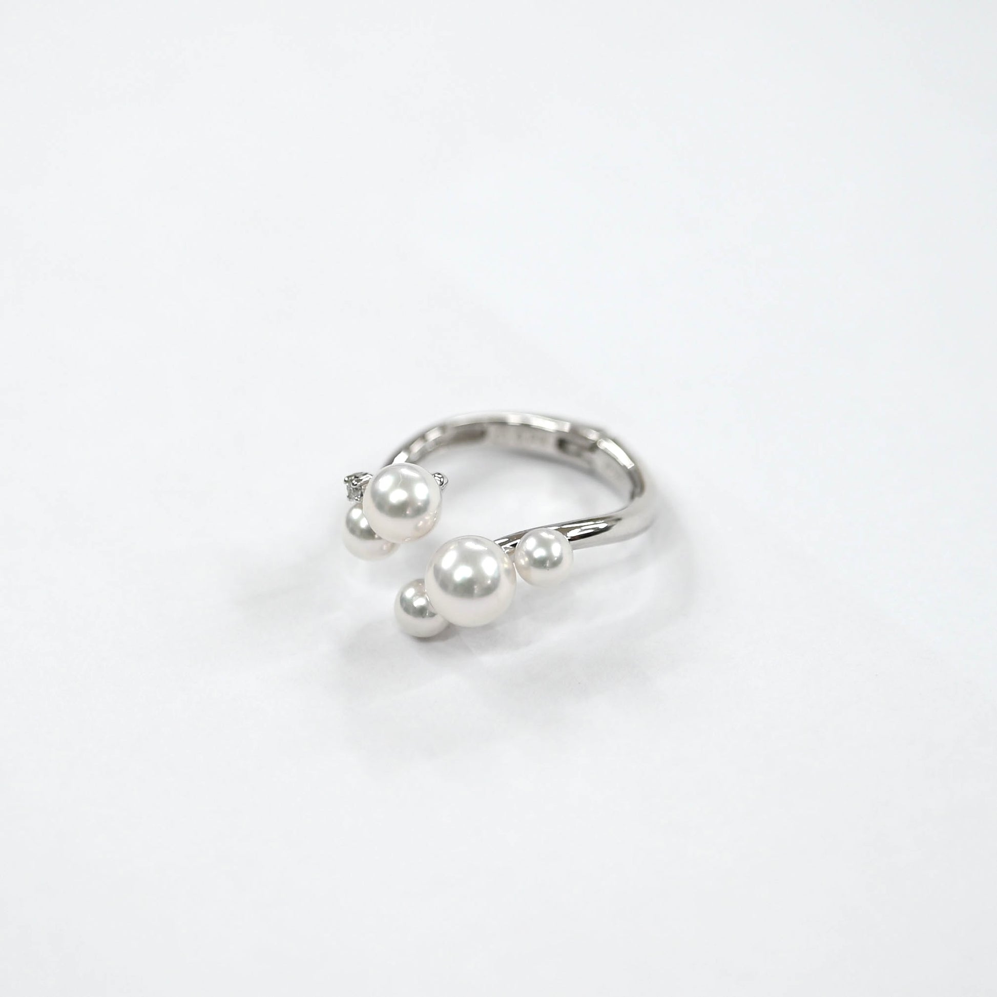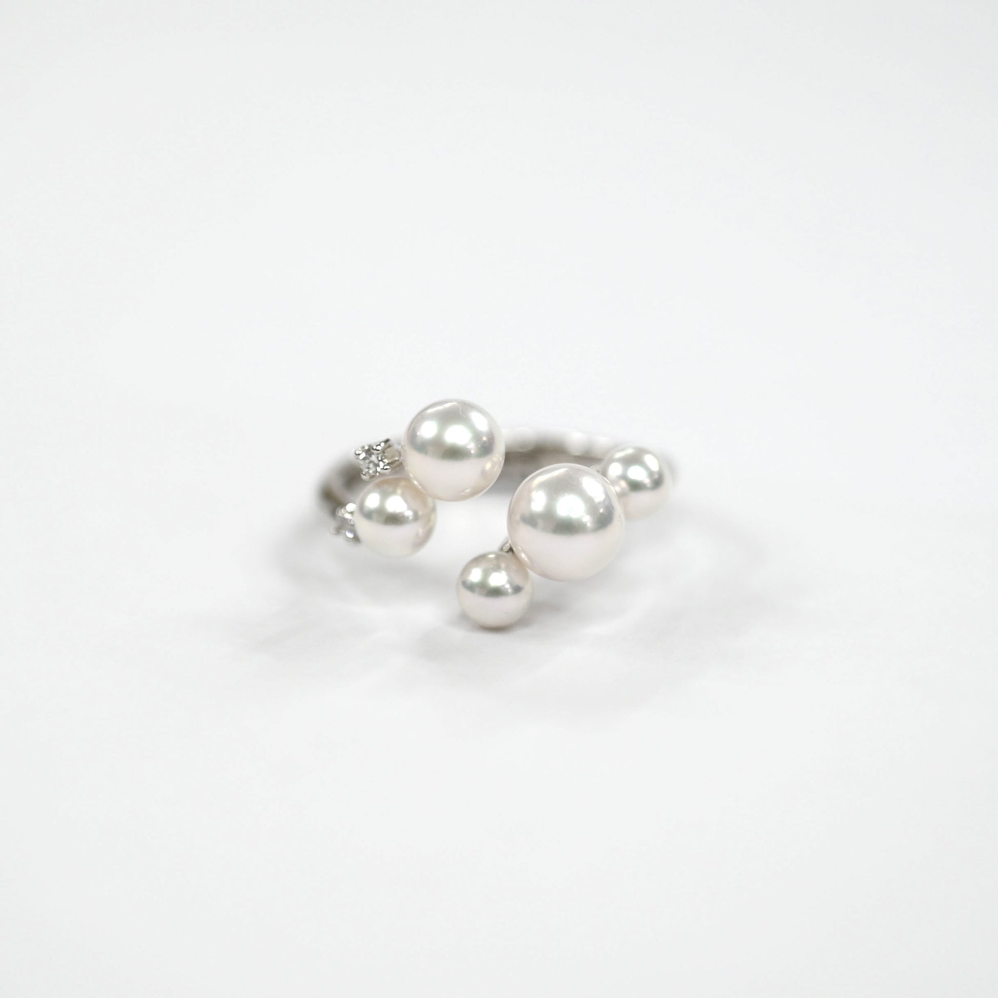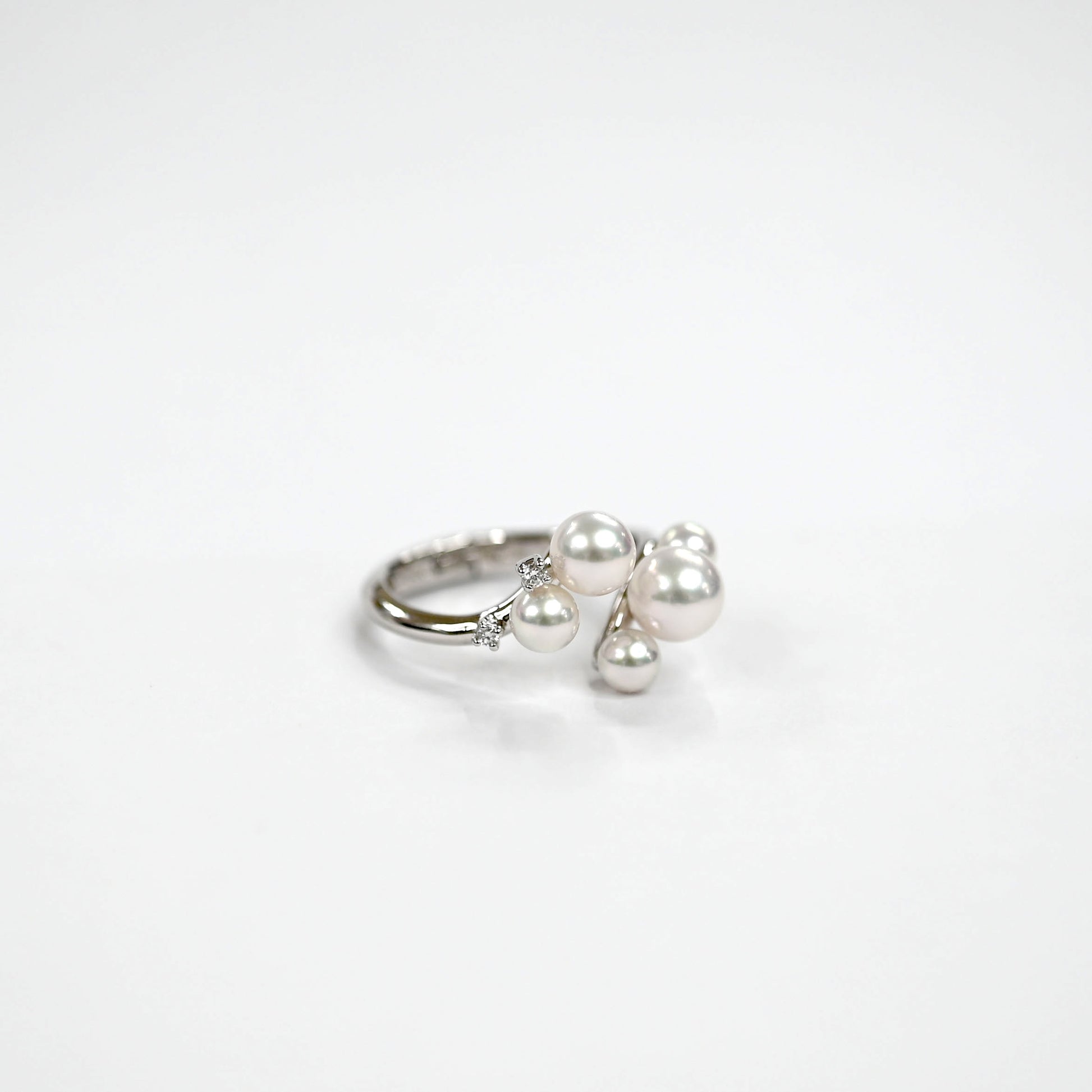 This Platinum 900 ring showcases Akoya pearls with a delicate iridescent sheen, carefully hand-selected for their beauty.